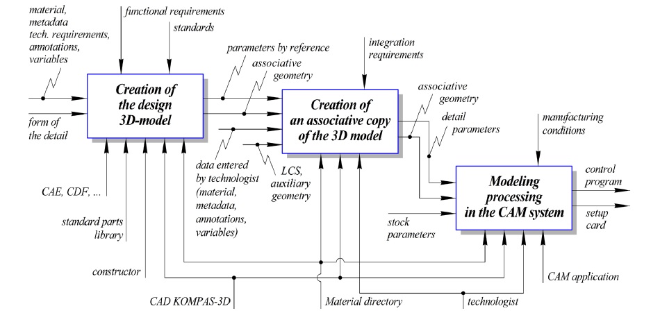 Materials and Methods. The work is the development of the concept of end-to-end design and technological parametrization in Computer-Aided Manufacturing. The theoretical research is based on the formal theory of data representation and processing, the set theory, and the theory of hierarchical multilevel systems. The software implementation was carried out in the Visual Studio C++ environment using KOMPAS-3D application program interface and the C3D geometric kernel application program interface.