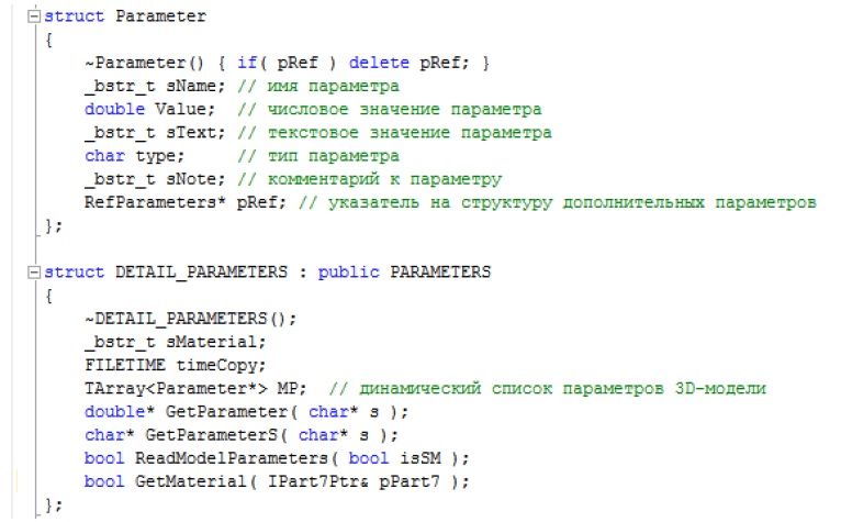 Формулы, связывающие параметрические переменные, могут содержать алгебраические и тригонометрические функции, логические операции и скобки. В результате лексического анализа распознаются последовательности символов (лексемы), которые потенциально могут являться именами параметров. Для получения числового значения параметра используется виртуальная функция GetParameter базового класса, которая переопределяется в производных классах. Метод DETAIL_PARAMETERS::GetParameter (рис. 5) принимает на вход лексему и возвращает адрес соответствующей переменной типа double. Использование указателей на переменные обеспечивает получение актуальных значений параметров. Нулевое значение адреса означает, что параметр по входному имени не обнаружен. Аналогично работает и метод DETAIL_PARAMETERS::GetParameterStr, возвращая адрес первого символа строки, если параметр содержит текстовое значение.