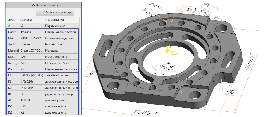 Далее с помощью API КОМПАС-3D считываются метаданные и аннотации 3D-модели (рис. 7). Метаданные извлекаются из свойств 3D-документа, параметры аннотаций – из обозначений размеров и шероховатостей. При получении параметра шероховатости распознается ее условное обозначение Ra или Rz. Размеры распознаются вместе с их предельными отклонениями и допусками. Аннотации, значения которых планируется использовать в параметрических расчетах, должны быть предварительно проставлены на 3D-модели.