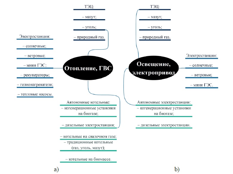 a) для отопления и ГВС; b) для освещения, электроприводов, систем управления