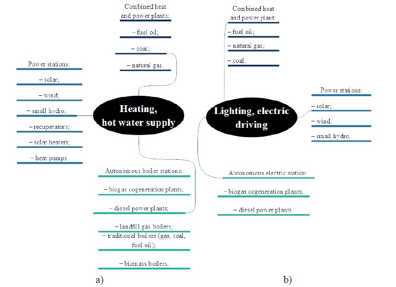 Results. Energy sources can be divided into traditional (diesel generators and gas generator plants) or renewable ones (wind turbines, solar collectors, mini hydro systems). Energy source is chosen either with the help of the economic criterion, being the cost of one k·Wh of energy or the criterion of environmental compatibility, or total specific emission of pollutants from energy generation at local generating sources (g/k·Wh). Here, not only the quantity of emissions, but also the harmful effect on the environment is considered.