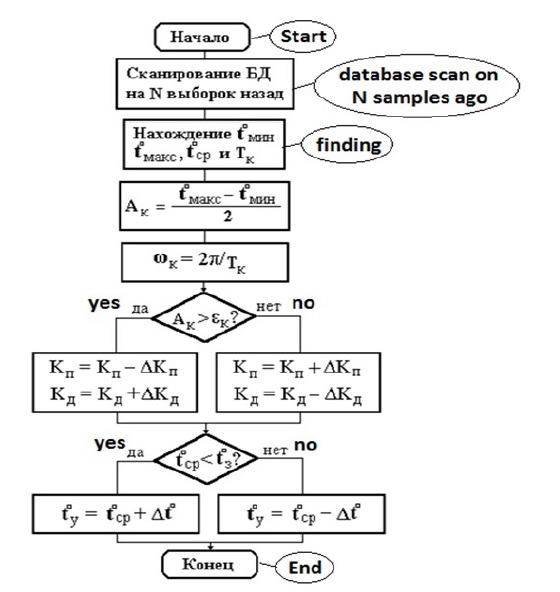 Fig. 3. Algorithm for determining the process parameters and adjusting the coefficients of the PID controller