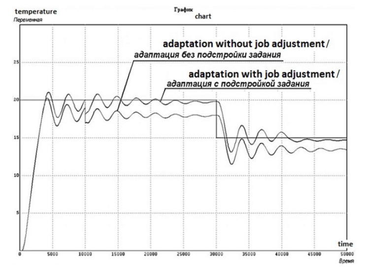 Предлагаемый алгоритм адаптации, заключающийся в аддитивной подстройке коэффициентов ПИД-регулятора, удобно реализуемый в SCADA-системе, обеспечивает компенсацию неопределенности модели и возмущений, при этом достигается требуемая точность поддержания температуры в теплице. Результаты исследования послужат материалом для разработки многоконтурной САУ микроклимата теплицы с исследованием влияния и компенсации параметрической и структурной неопределенности, инерционностей и нелинейностей реальных элементов. Выводы работы могут быть использованы во многих отраслях народного хозяйства для исследования общих и прикладных проблем цифрового адаптивного управления процессами6с ПИД-регулированием координат [16], например, в системах управления интеллектуальными зданиями [17], в радиотехнике [18], в пищевой промышленности [19], в стройиндустрии [20], в производстве резинотехнических изделий [21] и т. д.