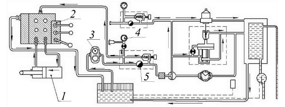 1 – hydraulic cylinder; 2 – distributor; 3 – pump; 4 – pressure gauge; 5 – throttle