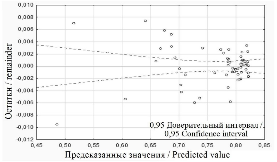 Так как d = 1,87 > DU ‒ 3(dkp) = 1,73, то гипотеза о независимости остатков регрессионной модели (2) на 5-процентном уровне не отвергается.