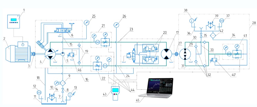 4, 17 – tested hydraulic pump and hydraulic motor; 5 – feed pump;6 – servo distributor; 7, 33 – suction lines; 8, 35 – valves;