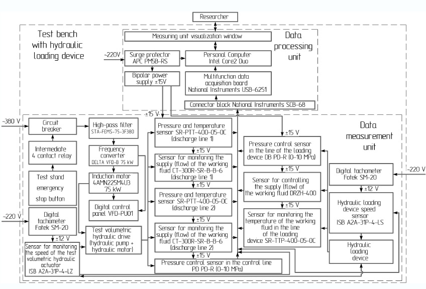 В блоке измерения данных использовалось следующее оборудование: трехфазный асинхронный электродвигатель 4АМН225М4У3 (75 кВт), частотный преобразователь DELTA VFD-B (75 кВт/380 В), реверсивные дроссели-расходомеры CT-300R-SR-B-B-6 (Webtec), испытуемый гидропривод, реверсивный гидронасос 310.3.112, индуктивные датчики контроля частоты вращения вала гидронасоса, гидромотора и нагружающего устройства ISB A2A-31P-4-LZ, аналоговые датчики давления и температуры SR-PTT-400-05-0C (Webtec), портативное считывающее устройство HPM-540-05-0C с комплектом аналоговых кабелей SR-CBL-003-55-MM (Webtec). Рама стенда с гидравлическим нагружающим устройством и соединительные муфты были изготовлены индивидуально.