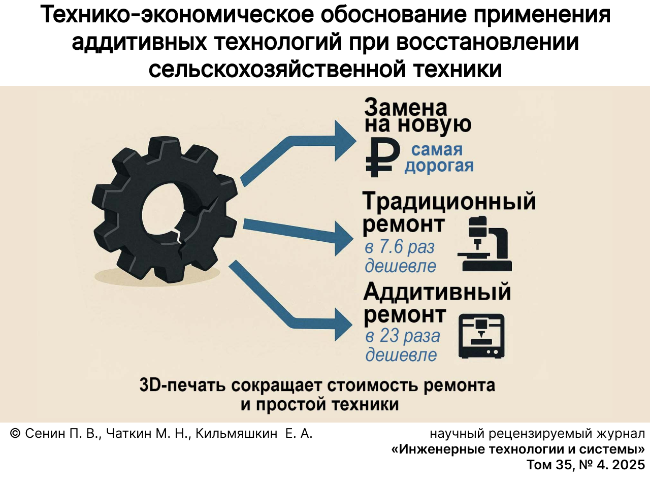 Materials and Methods. The study was carried out on the basis of the Design and Rapid Prototyping laboratory of the Institute of Mechanics and Power Energy of the National Research Mordovia State University. The electric linear concave drive of the John Deer combine harvester was repaired using 3D-printing. According to the proposed methodology, there has been analyzed the economic efficiency of using additive technologies to produce failed parts during the repair of machinery.