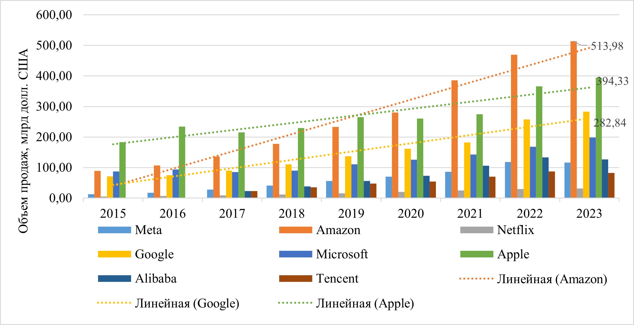 Для оценки современного экономического состояния ведущих мировых цифровых экосистем необходимо провести сравнительный анализ их основных экономических показателей с традиционными лидерами по объемам продаж и рыночной капитализации, входящими в список Fortune 500 [38]. На рис. 1 представлена динамика продаж самых популярных владельцев цифровых экосистем b2c за последние 9 лет. Очевидно, у каждой компании свой темп роста, а наиболее высокие показатели дохода у Amazon, Google и Apple. Рекордные темпы роста за 9 лет продемонстрировали Meta1, которой удалось нарастить объем продаж более чем в 9 раз, Amazon и Netflix – более чем в 5,5 раз.