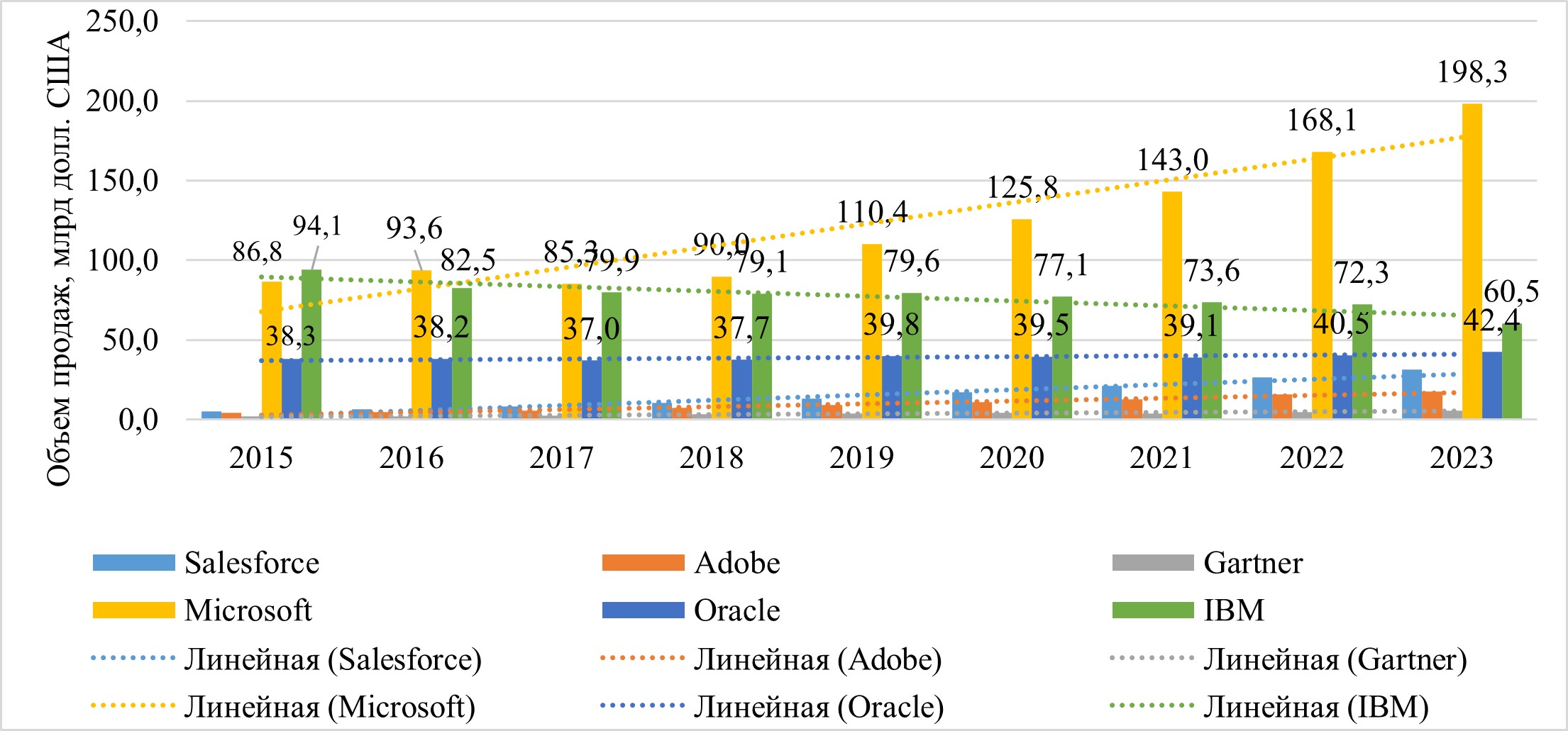 По показателю продаж в абсолютном выражении указанные компании в несколько раз меньше Amazon, Google и Apple. Экосистема Microsoft, в значительной мере присутствующая в сегменте b2b-решений, продемонстрировала высокие темпы роста. За рассмотренные 9 лет (2023 к 2015 г.) наиболее быстро растущими стали Saleseforce (с темпом в 583 %), Adobe (424,5 %) и Gartner (271 %), сконцентрированные на предоставлении комплексных b2b-решений. IBM, анонсировавшая несколько лет назад запуск экосистемы ПО для квантовых вычислений, пока снижает свою доходность: темп роста продаж за последние 9 лет не превысил 85 % [42]. На достаточно стабильном уровне, без особенных пиков роста, осуществляет свою деятельность Oracle.
