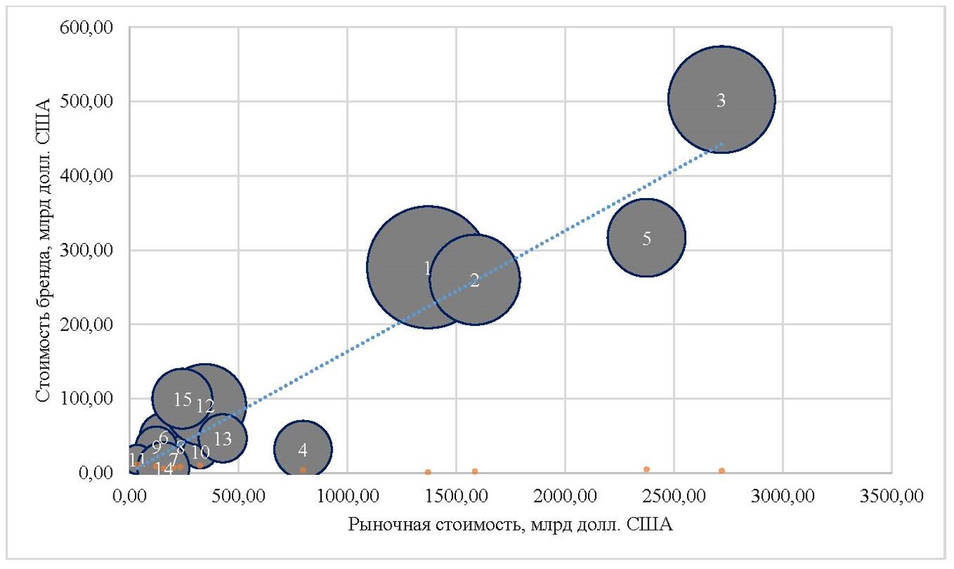 Fig. 3. Positions of digital ecosystems in the capitalization level-brand value matrix: 1 – Amazon; 2 – Google; 3 – Apple; 4 – Meta1; 5 – Microsoft; 6 – Walt Disney; 7 – Netflix; 8 – Adobe; 9 – IBM; 10 – Oracle; 11 – Salesforce; 12 – Samsung Electronics; 13 – Tencent (Asset value is presented instead of market values); 14 – Huawei; 15 – Alibaba. The diameter of the circle is the revenue level in 2023