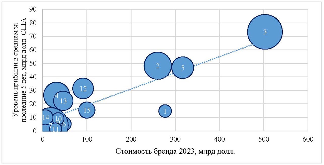 Рис. 5. Позиции цифровых экосистем в матрице «уровень прибыли − стоимость бренда»: 1 – Amazon; 2 – Google; 3 – Apple; 4 – Meta1; 5 – Microsoft; 6 – Walt Disney; 7 – Netflix; 8 – Adobe (нет сопоставимых данных); 9 – IBM; 10 – Oracle; 11 – Salesforce (уровень прибыли представлен в среднем за 4 года); 12 – Samsung Electronics; 13 – Tencent; 14 – Huawei; 15 – Alibaba. Диаметр круга – уровень дохода в расчете на одного сотрудника в 2023 г.