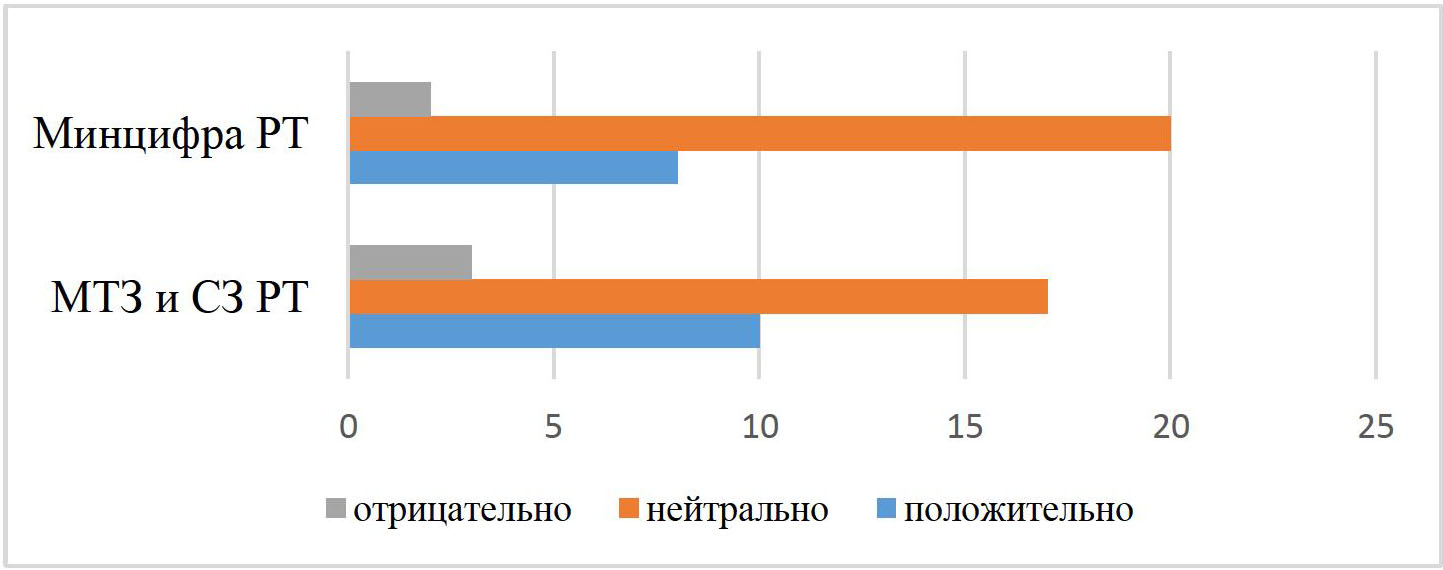 83 % опрошенных (25 чел.) в МТЗ и СЗ РТ относятся к ИИ нейтрально, 17 % (5 чел.) – отрицательно. В Минцифре РТ результаты иные: 93 % (28 чел.) – положительно и 7 % (2 чел.) – нейтрально.