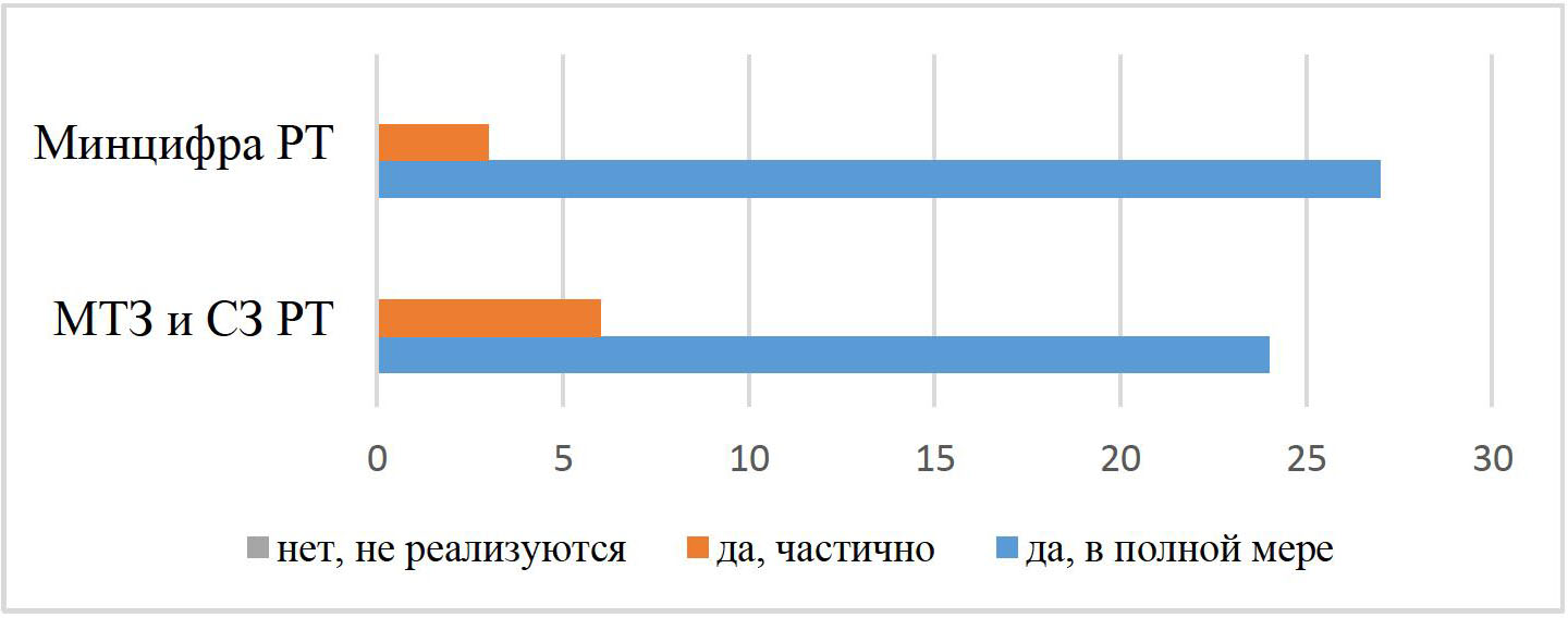 - Минцифра РТ: да, в полной мере – 90 % (27 чел.), да, частично – 10 % (3 чел.).