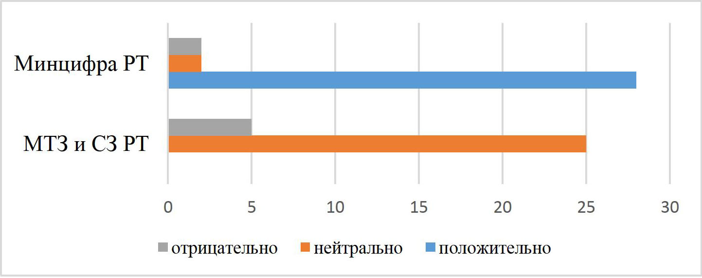Авторами выявлено и проанализировано отношение государственных служащих к внедрению инноваций. Отметим, что большинство опрошенных двух министерств (МТЗ и СЗ РТ – 57 % (17 чел.), Минцифра РТ – 67 % (20 чел.)) имеют нейтральное отношение к внедрению инноваций.