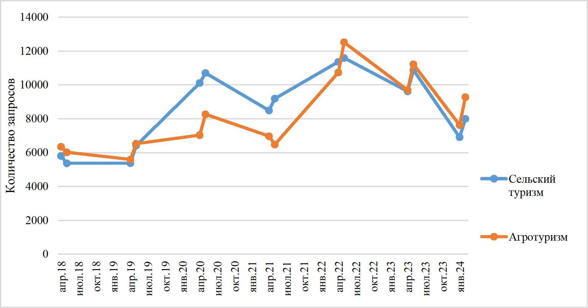 В условиях цифровизации экономики важным фактором развития сельского/аграрного туризма становится эффективность использования интернет-платформ. Подобные площадки позволяют предпринимателям увеличить клиентскую базу, совершенствовать опыт работы в реальном секторе экономики и в виртуальных онлайн-сервисах. Потребители услуг в этом случае расширяют количество рассматриваемых туристических предложений и скорость доступа к ним. Обратим внимание, что по данным статистики Яндекса (сервис Вордстат) число поисковых запросов на темы «сельский туризм», «агротуризм» с апреля 2018 г. по апрель 2023 г. увеличилось на треть (с 5806 до 9622 и 6351 до 9693 соответственно) (см. рисунок).