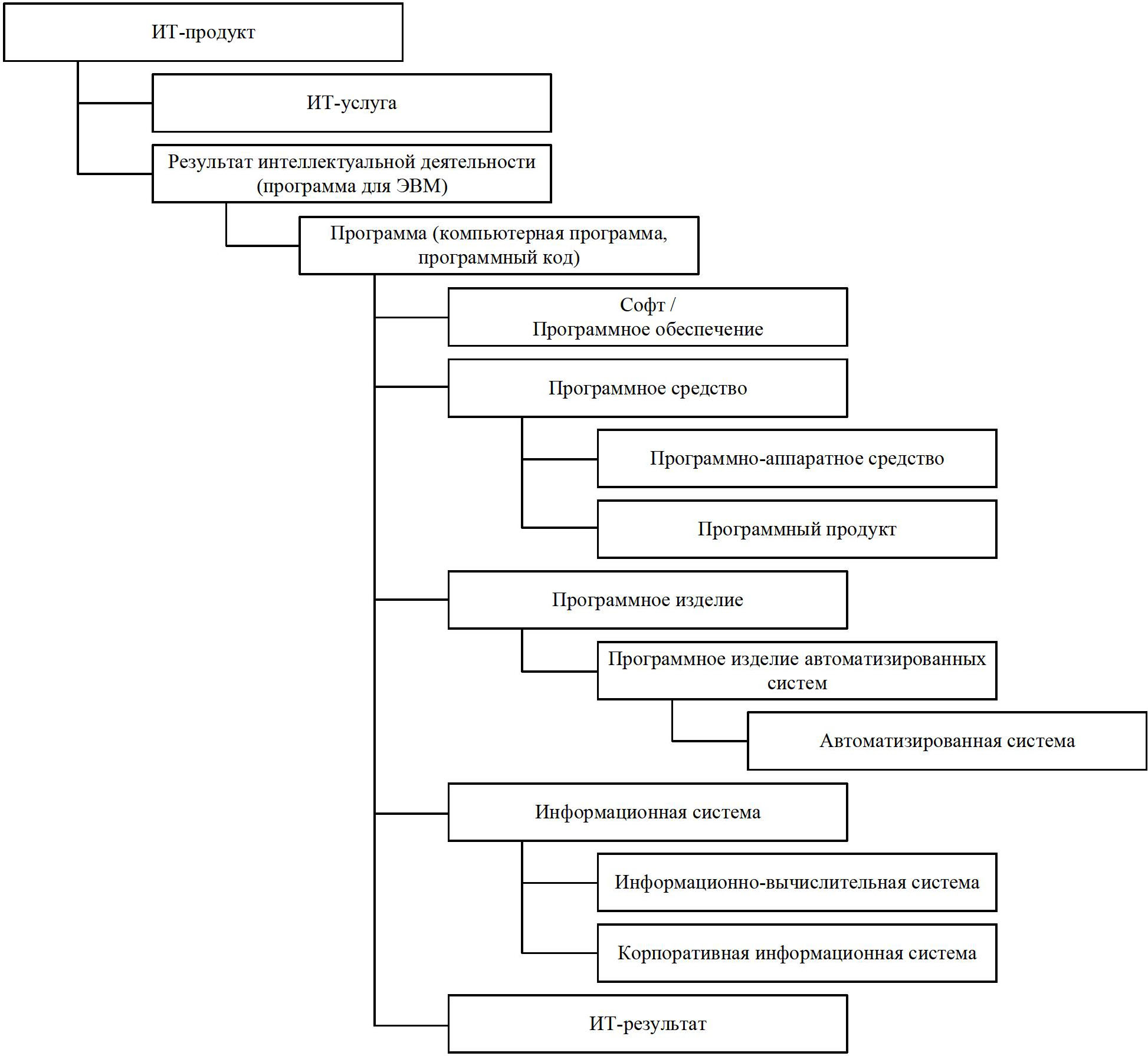 Несмотря на легальное определение, зафиксированное в ст. 1 261 ГК РФ, в научной и профессиональной литературе используется множество разрозненных понятий описывающих объекты, которые создаются во время выполнения ИТ-проектов. В частности, «программное обеспечение», «софт», «программный продукт», «информационная система» и др. [8–13].