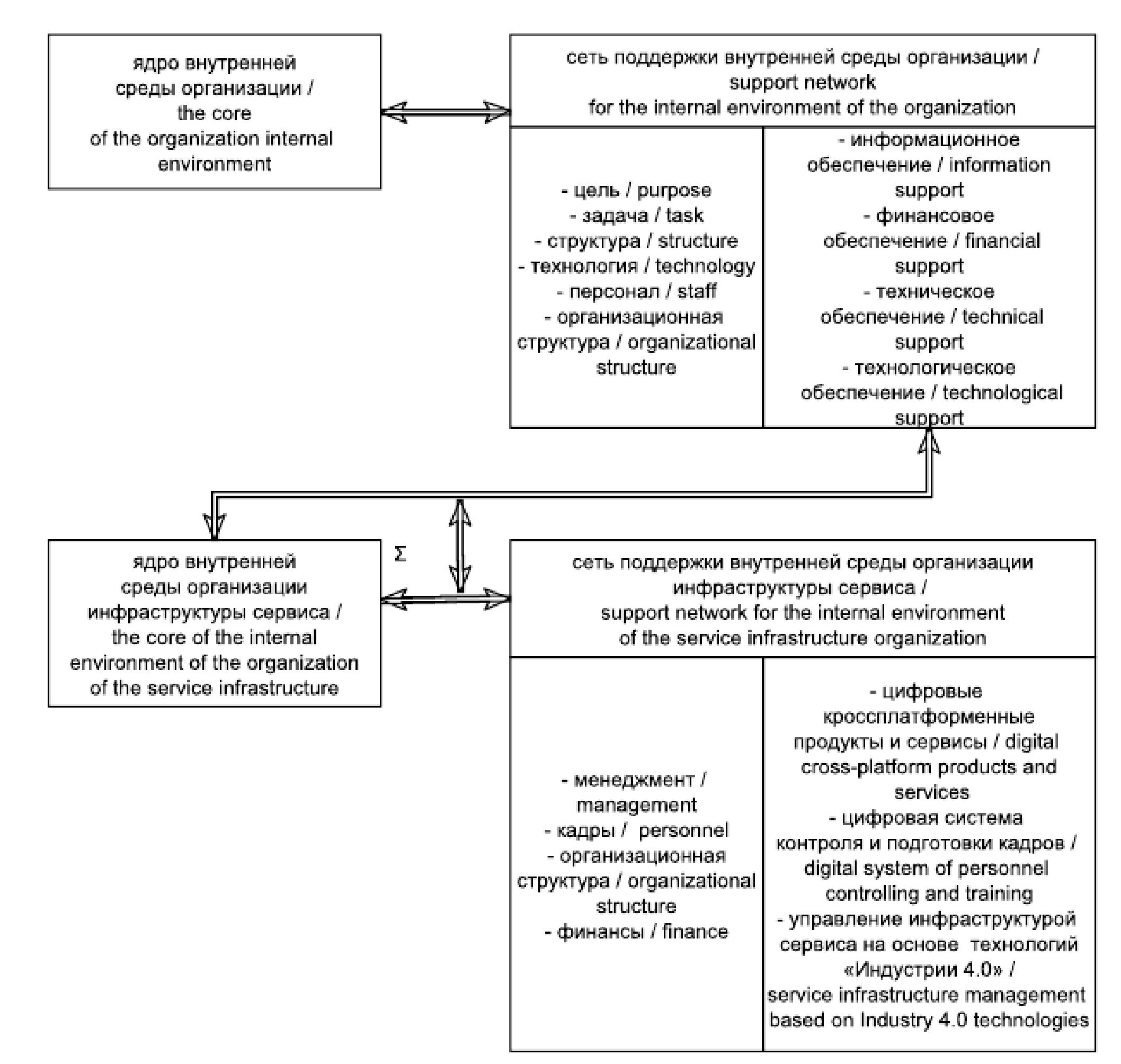 Инфраструктура сервиса охватывает значительную сферу общественных отношений, включающую совокупность объектов, технических средств и информационных технологий, которые обеспечивают взаимодействие между заказчиком и поставщиком услуг при удовлетворении и реализации запросов потребителя (заказчика услуг) в услугах, сервисах и иных благах в объеме и качестве, котором он ожидает. Хозяйственные связи, которые при этом возникают, обусловлены свойствами компонентов организационной структуры внутренней среды предприятия (поставщика услуг). В условиях внедрения технологий «Индустрии 4.0» устоявшаяся система связей компонентов внутренней среды, считавшаяся ранее эффективной и сбалансированной на протяжении длительного времени, способна превратиться в тормоз для его развития. Причиной этого являются проблемные факторы, возникающие из-за запаздывания адаптации внутренней среды к изменениям хозяйственных связей под влиянием цифровых технологий.