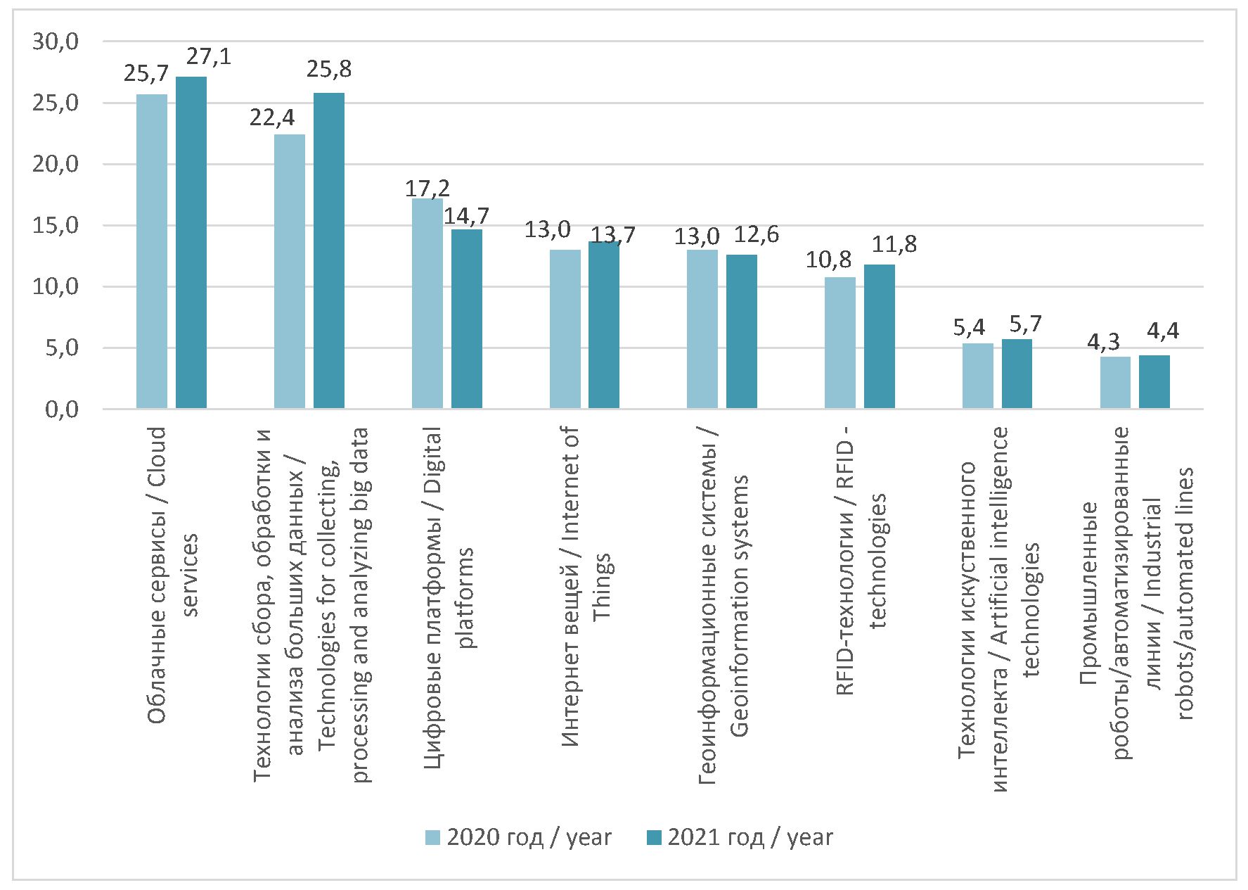 Рис. 2. Использование цифровых технологий в организациях, %, составлено автором по данным [21].