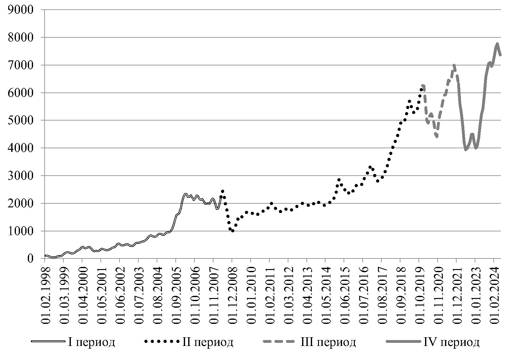 IV период равен временному отрезку январю 2022 г. – июню 2024 г., который соотносится с этапами развития экономики: ростом в российской хозяйственной системе, экономическим кризисом в нашей стране на фоне специальной военной операции России в Украине, восстановлением экономического развития отечественного хозяйства (рис. 3).