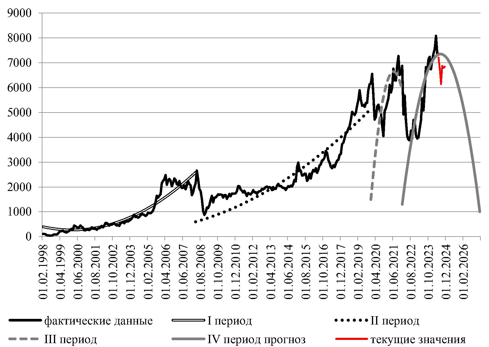 На рис. 4 представлены графики полиномиальных моделей тенденции второй степени с функцией прогноза котировок акций ПАО «НК «Лукойл» в пределах выделенных экономических циклов, начинающихся и заканчивающихся экономическим ростом: в I периоде, охватывающем временной интервал февраль 1998 г. – апрель 2008 г., модель полинома второй степени соответствует параболе, не имеющей максимальных уровней, она последовательно повторяет понижательную и повышательную стадии экономического цикла, ее динамика говорит о том, что в будущем котировки акций анализируемой компании будут увеличиваться после коррекции; во II периоде, включающем апрель 2008 г. – декабрь 2019 г., полиномиальная модель второго порядка демонстрирует продолжительный рост анализируемого индикатора, графически совпадая с параболой, не имеющей максимальных уровней, она свидетельствует о том, что в долгосрочном периоде котировки акций изучаемой компании достигнут более высоких вершин; в III периоде, начинающемся с декабря 2019 г. и заканчивающимся январем 2022 г., модель полинома второй степени подобна параболе без минимальных уровней, она была способна предсказать максимальное значение котировок акций и время его достижения, указывая на то, что длительный рост котировок акций российской нефтяной компании подходит к концу; в IV периоде, представляющем собой интервал времени январь 2022 г. – июнь 2024 г., модель полинома второго порядка, прежде всего, способна сделать прогноз котировок акций на среднесрочную перспективу, сущность которого заключается в том, что увеличение интересующего индикатора практически исчерпало себя и данные инвестиционные активы целесообразно продать.