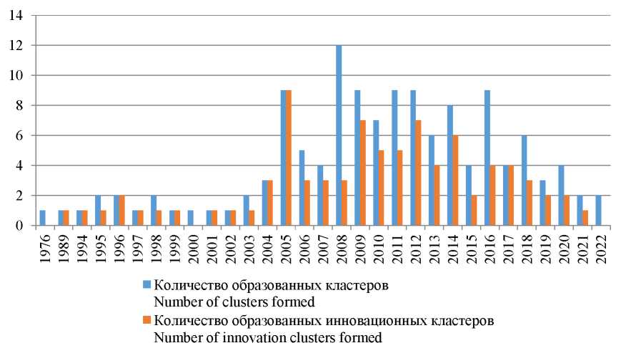 Как можно заметить, доля инновационных кластеров за 2021−2024 гг. увеличилась, что вызвано потребностью отрасли в высокотехнологичных решениях для обеспечения скорости, безопасности, экологичности, высокого качества обслуживания и других показателей работы современного транспорта. При этом наиболее высокая интенсивность формирования инновационных ТЛК наблюдалась в 2005, 2009, 2012 гг.