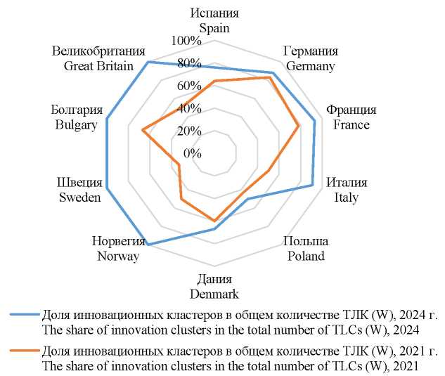 Особое значение для повышения эффективности региональных ТЛС имеет инновационность кластеров. На рис. 2 отражены данные о доле инновационных кластеров в странах-лидерах кластеризации в сфере транспорта и логистики (к странам-лидерам кластеризации отнесены страны, в которых общее количество ТЛК более трех) в 2021 и 2024 гг.