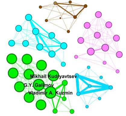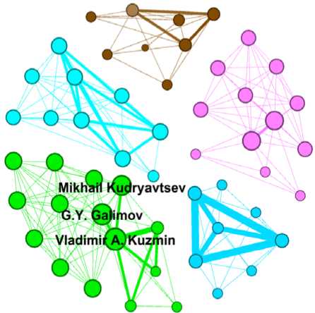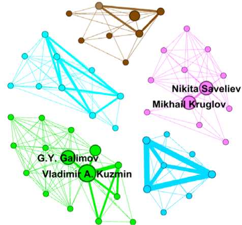 Для позиционного анализа стоит рассматривать не всю сеть в целом, а наиболее крупные и «дружные» кластеры, которые были объединены для написания двух и более работ. Сосредоточимся на пяти кластерах, которые составляют 21 % от исходного графа (рис. 3), и рассмотрим для них основные меры центральности, характеризующие значимость узла в разных аспектах.