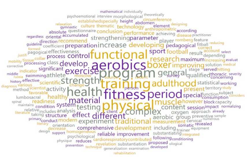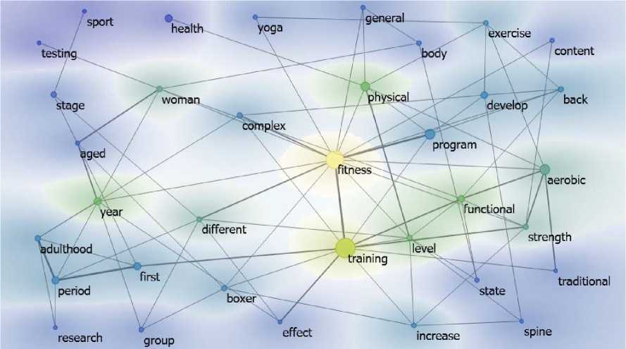 Ключевыми словами первого кластера стали: fitness, physical, training, strength. Таким образом, первый кластер включил в себя статьи по направлению фитнес-йоги в контексте улучшения физических показателей (рис. 11, 12).