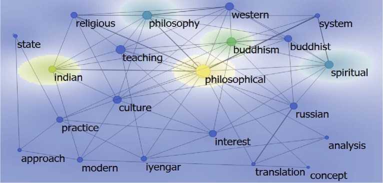 Fig. 21. Network of interrelation between the words in the cluster “Culture and philosophy of yoga" (without including the word yoga in the analysis)