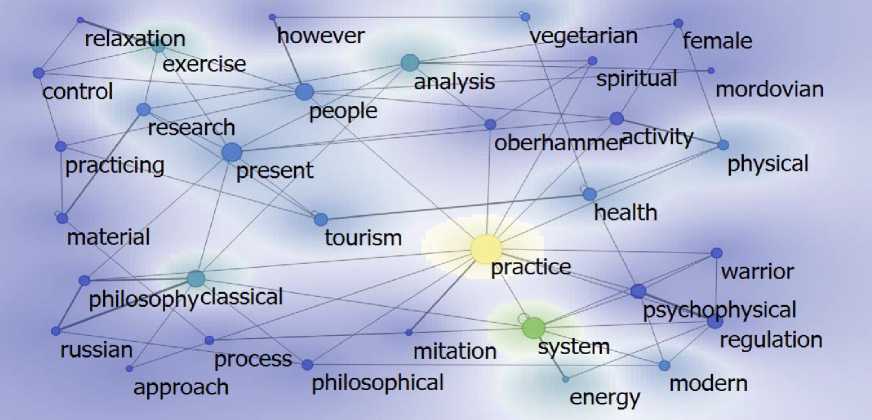 В ходе исследования был проведен анализ ключевых слов в выгруженных аннотациях. Самыми часто употребляемыми словами являются: yoga, exercise, study (два значения − исследование и учение), physical, training, patient, treatment, group, health, practice (рис. ). Вокруг ключевых слов, обладающих высокой статистической значимостью, выстраивается сеть взаимосвязей со словами, обладающими меньшей статистической значимостью и встречающимися в текстах реже.