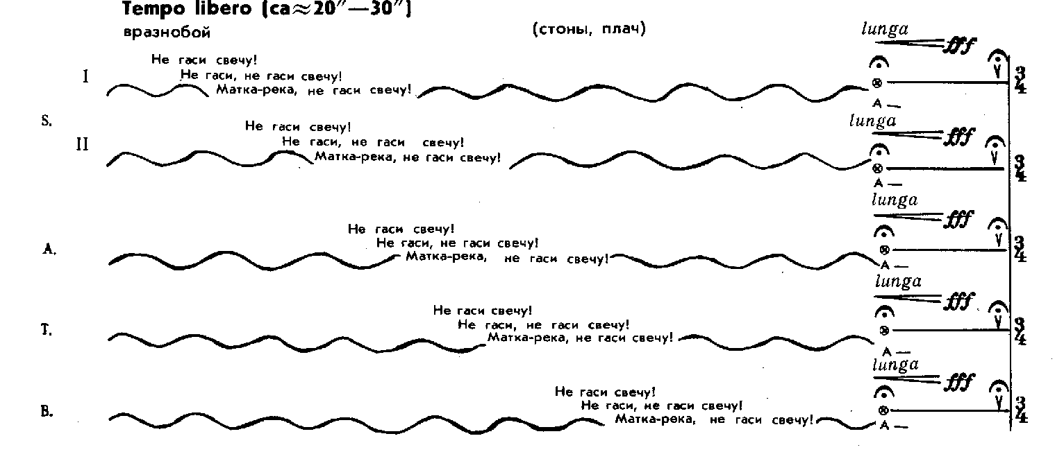 Сопровождаемый хором, изображающим звон колокола, голос героя как заклинание произносит свою просьбу к матери-реке не гасить свечу на лодочке, словно от этого будет зависеть вся его дальнейшая судьба. К заклинанию героя присоединяется хор, и он уже не поёт, а кричит вразнобой, со стонами и плачем, словно стадо заблудших овец или полные ужаса голоса из преисподней. В партитуре этот момент выглядит таким образом: