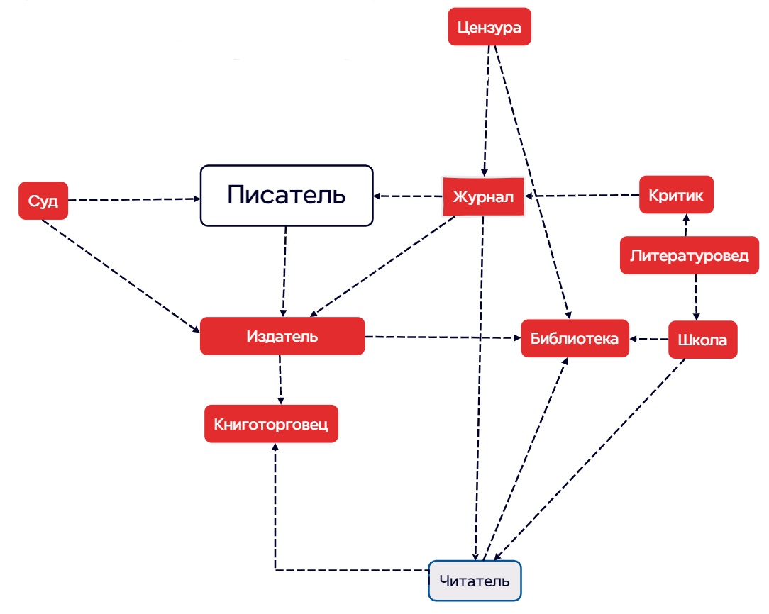 В своей книге Л.Д. Гудков и Б.В. Дубин показали, что каждый функциональный узел института литературы состоит из структурно-функциональных подсистем, а также описали, как эти подсистемы развивались под влиянием внешних обстоятельств и внутренней логики со времени Романтизма до 1980-х гг. Исследователи кратко охарактеризовали национальную и историческую специфику институализации литературы во Франции, Германии, США, а затем подробно остановились на описании факторов, определивших структуру отечественного института литературы. Ключевым фактором, повлиявшим на облик социального института литературы в Российской империи, а затем в СССР, авторы считали доминирующую роль государственной власти в развитии книгоиздания. Так, на рис. 1 видно, что накануне Перестройки все коллективные акторы социального института литературы представляли те или иные государственные институции.
