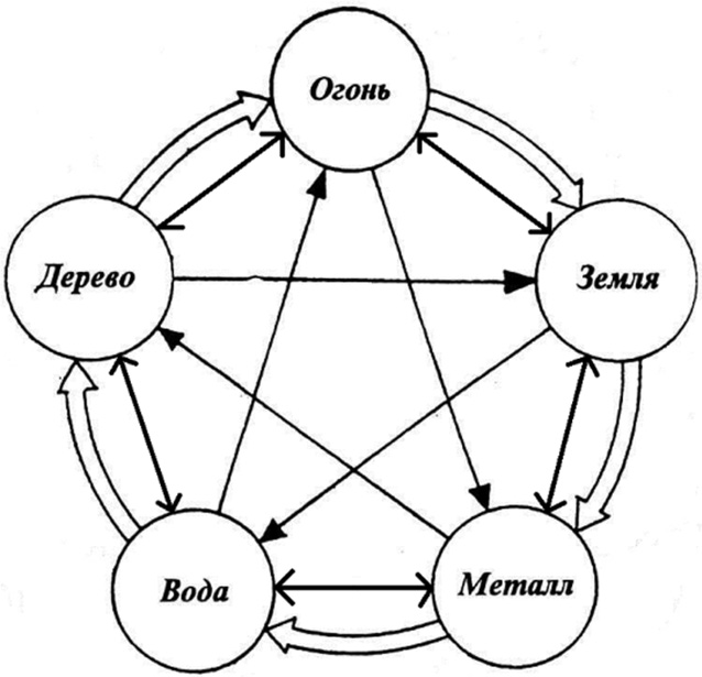Об истинности вышеозначенной формулы свидетельствует многовековая теория и практика традиционной китайской медицины, целью которой является лечение человека путем достижения баланса пяти видов энергии в его организме. Она показывает, и современная медицина это подтверждает (см. рис. 2), что активизация в организме человека печени (энергия «дерево»), за счет выброса желчи, приведет к излишней активности сердца (т. е. «огня»), которую призваны обуздать почки (т. е. «вода»), и что в противном случае возможны заболевания селезенки или поджелудочной железы (т. е. энергия «земля»). Кроме того, «гуморальная» теория Гиппократа (V–IV вв. до н. э.) — основоположника европейской медицины — обосновывает основные типы конституции людей и их психологические особенности наличием в их организме определенного доминирования стихий. Это позволило Гиппократу найти ключ к пониманию психофизиологии и патологии человека, а следовательно, к его врачеванию: «флегматик» («земля, «вода»), сангвиник («огонь», «воздух»), меланхолик («земля», «воздух»), и холерик («воздух», «огонь»). Отметим, что эта теория Гиппократа не отвергается современной медициной.