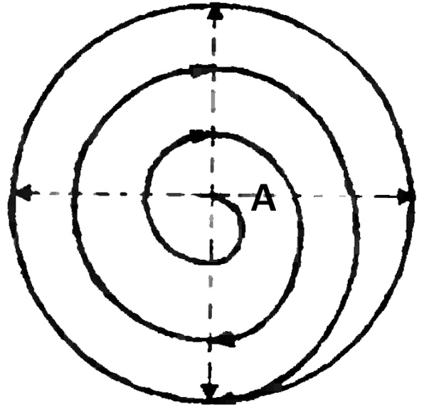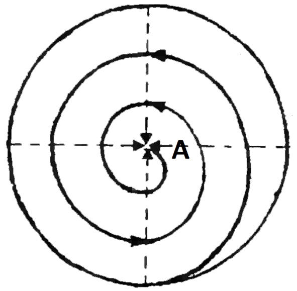Рис. 4. Инволюционная (сужающаяся) спираль Дао, где энергия «инь» стремится к точке А – центру Вселенной [Источник: Лукьянов А.Е. Истоки Дао. 1992]