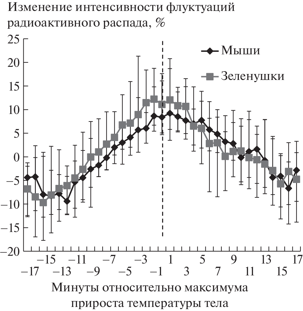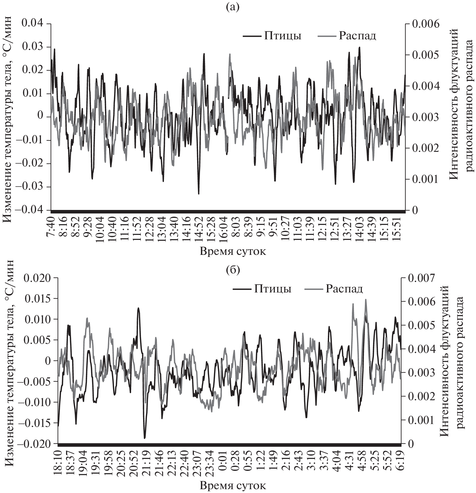 The body temperature rhythms in laboratory mice C57Bl/6 and common greenfinches (Chloris chloris) and the moments of feeding by common starlings (Sturnus vulgaris) have been compared with the intensity of fluctuations of 40К radioactive decay. It was found that body temperature changes in greenfinches and mice positively correlate with the intensity of fluctuations of 40K radioactive decay. The method of superimposed epochs shows that the increase of body temperature in mice, reflecting the phase of the beginning of sleep/wake cycle activity, as well as food intake by starlings are observed at an increase in the intensity of 40K radioactive decay. Thus, animal activity in the ultradian range of periods may be related to external quasi-rhythmic physical influences, rather than determined only by endogenous processes. Given the extremely low dose of natural 40К exposure, a factor that can cause observed radioactivity fluctuations may be biotropic.