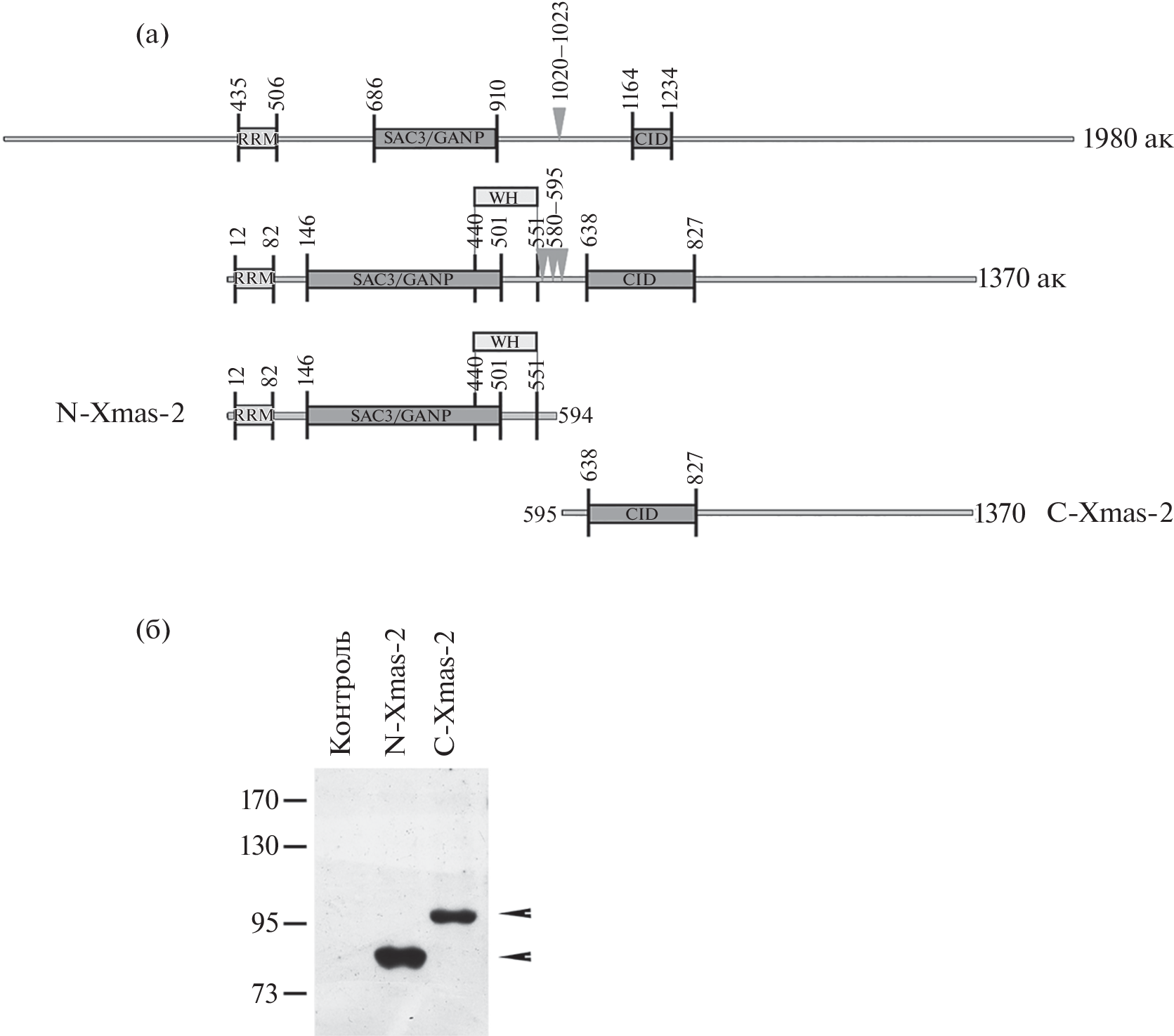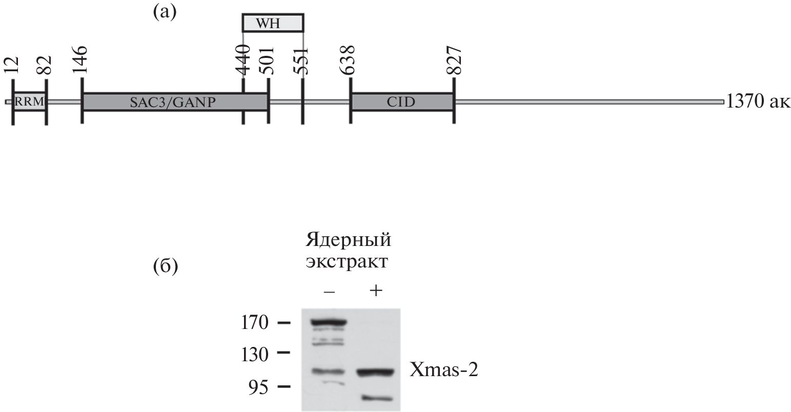 The TREX-2 complex integrates several stages of gene expression, such as transcriptional activation and mRNA export. In D. melanogaster TREX-2 consists of four main proteins: Xmas-2, ENY2, PCID2, and Sem1p. Xmas-2 protein is the core subunit of the complex with which other TREX-2 subunits interact. Xmas-2 homologues have been found in all higher eukaryotes. Previously, it was shown that the human Xmas-2 homologue, GANP protein can undergo cleavage into two parts, probably during apoptotic cell death. We showed that the Xmas-2 protein of D. melanogaster also can split into two fragments. The resulting fragments of the protein correspond to the two large domains of Xmas-2. Protein splitting is observed both in vivo and in vitro. However, Xmas-2 cleavage in D. melanogaster is observed under normal conditions and is probably a part of the mechanism of transcription and mRNA export regulation in D. melanogaster.