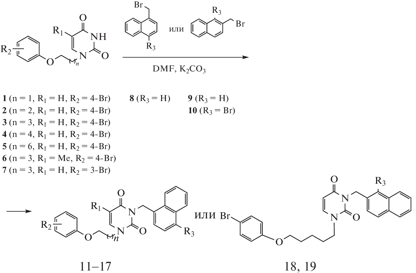 SYNTHESIS OF 1-[ω-(BROMOPHENOXY)ALKYL]-3-NAPHTHALENYLMETHYL DERIVATIVES OF URACIL AND THEIR ANALOGUES AS PROBABLE INHIBITORS OF HUMAN CYTOMEGALOVIRUS REPLICATION