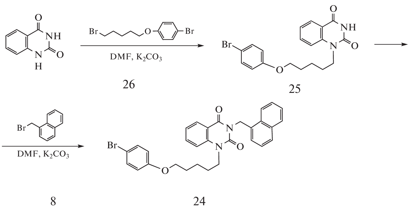 A new series of 1-[ω-(bromophenoxy) has been synthesizedalkyl]-uracil derivatives containing naphthalene-1-yl-, naphthalene-2-yl-, 1-brominaphthalene-2-ilmethyl, benzyl and anthracene-9-ilmethyl fragments in position 3 of uracil. Antiviral properties of synthesized compounds against human cytomegalovirus were studied. It was found that the compound, which has a bridge consisting of five methylene groups, has high anti-cytomegalovirus activity in vitro. uracil
