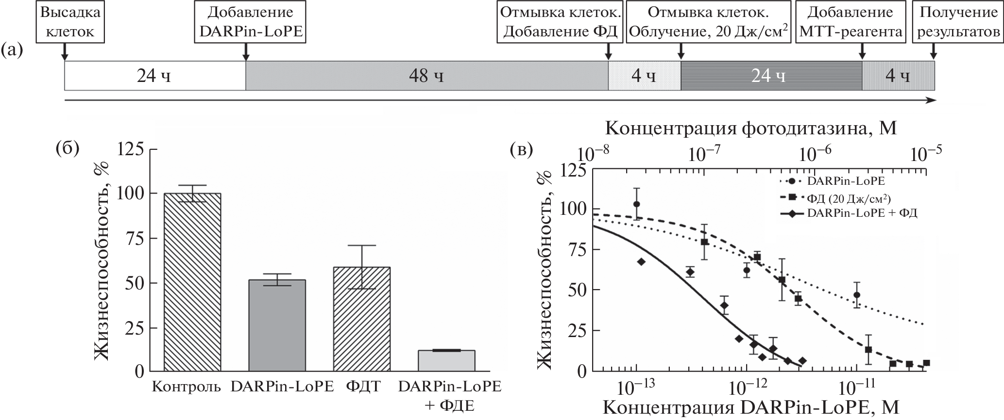 Development of combined schemes for the treatment of oncological diseases is a promising strategy to improve the effectiveness of antitumor therapy. This paper shows the fundamental possibility of multiplying the antitumor effect by combining targeted and photodynamic therapy. It has been demonstrated that sequential treatment of HER-2 positive breast cancer cells with the targeted toxin DARPin-LoPE and the photoactive compound Photodithazine leads to a synergistic enhancement of their effect. In the future, this approach is intended to achieve the maximum therapeutic effect while minimizing the risks of negative side effects.