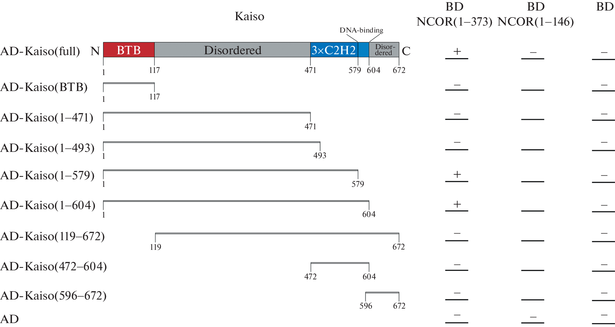 The vertebrate transcription factor Kaiso binds specifically to methylated DNA sequences using C2H2-type zinc fingers. In addition to C2H2-domains, the BTB/POZ domain, which forms homodimers, is located at the N-terminus of Kaiso. Kaiso, like several other well-studied BTB/POZ proteins, including BCL6, interacts with the NCoR (nuclear co-repressor) protein, which determines the landing of transcriptional repressive complexes on chromatin. Using the yeast two-hybrid system, we have shown that the N-terminal domain of NCoR interacts with the C-terminal zinc fingers of Kaiso, and not with its BTB/POZ domain, as previously assumed. The results obtained demonstrate that NCoR interacts with various transcription factor domains, which can increase the efficiency of attracting NCoR-dependent repressor complexes to regulatory regions of the genome.