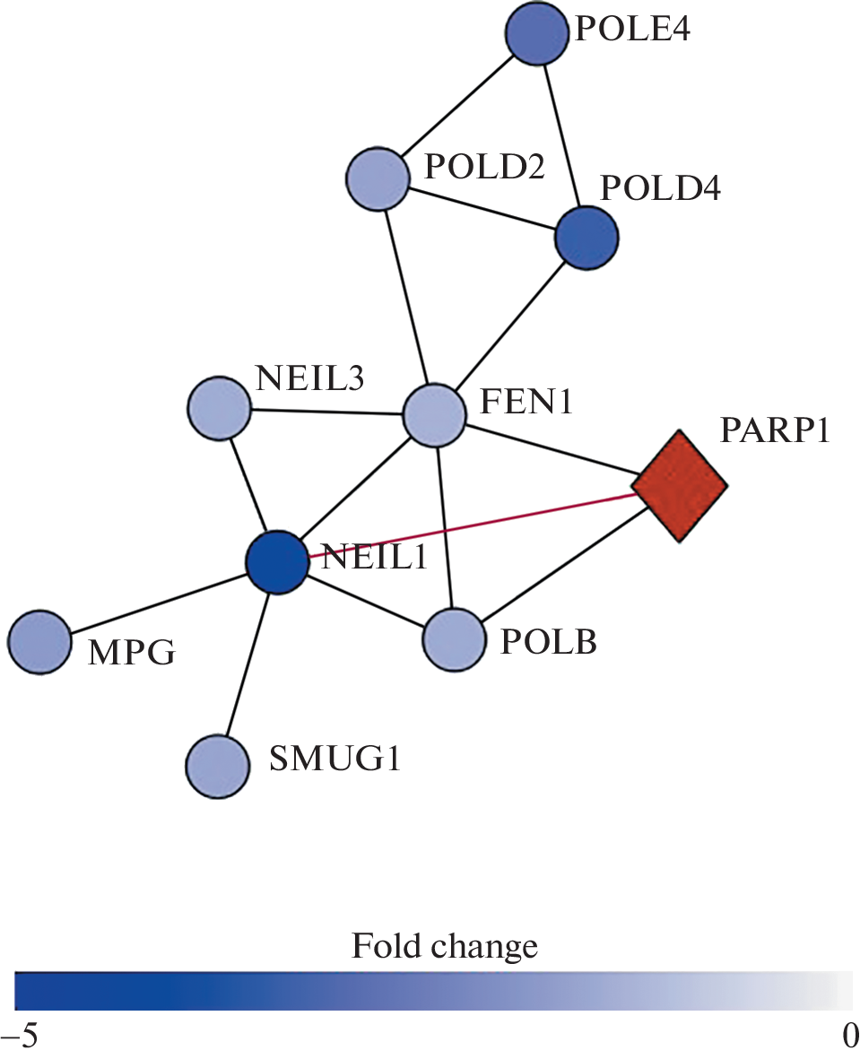 The effect of PARP1 knockout in HEK293 cells on the gene expression of DNA base excision repair (BER) proteins was studied. It was shown that the expression of all differentially expressed genes (DEGs) of BER was reduced by knockout. The expression of the DNA glycosylase gene NEIL1, which is considered to be one of the common “hubs” for binding BER proteins, has changed the most. The expression of genes of auxiliary subunits of DNA polymerases δ and ε is also significantly reduced. The PARP1 gene knockout cell line obtained is an adequate cell model for studying the activity of the BER process in the absence of PARP1 and testing drugs aimed at inhibiting repair processes. It has been found for the first time that knockout of the PARP1 gene results in a significant change in the level of expression of proteins responsible for ribosome biogenesis and the functioning of the proteasome.