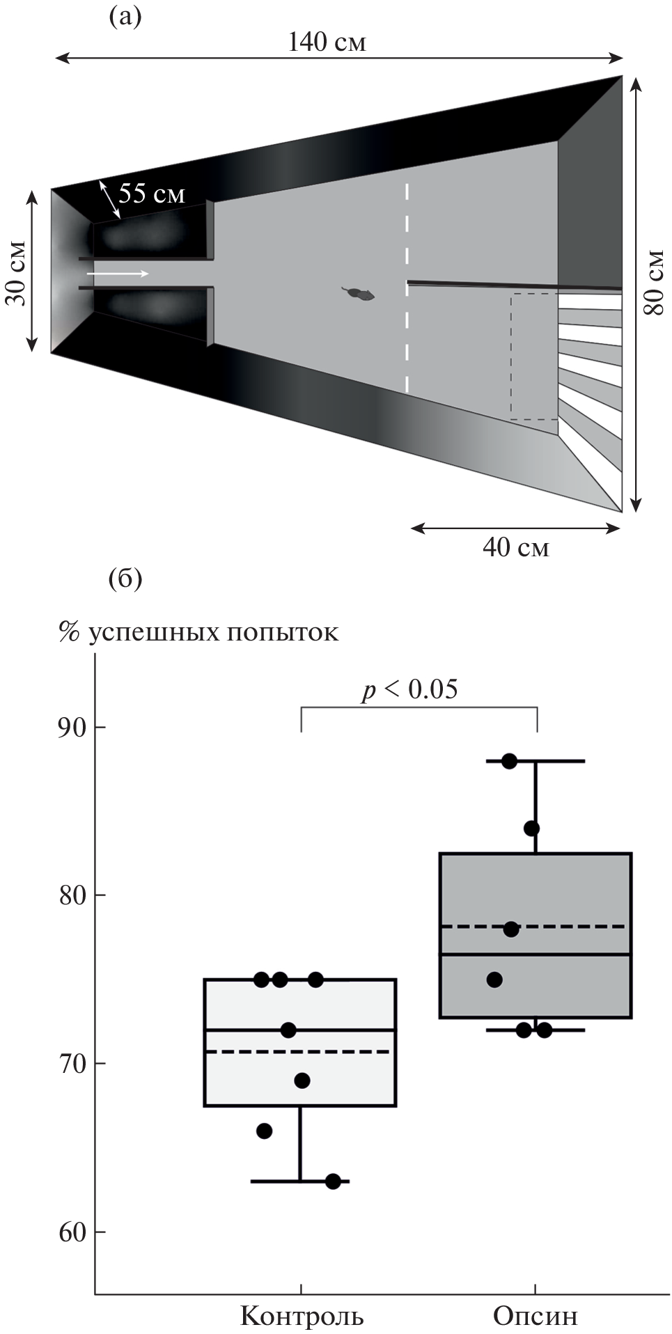Here, we explore the potential of an animal opsin non-selectively expressed in various neuronal elements of the degenerative retina to restore impaired visual function. In this study, a knockout murine model of inherited retinal distrophy was used. Animals were injected intravitreally with either a virus carrying gene of the short-wavelength cone opsin associated with a reporter fluorescent protein, or a control virus carrying the sequence of a modified fluorescent protein that had an enhanced membrane tropism. The viral transduction induced pronounced opsin expression in ganglion, bipolar, and horizontal retinal neurons. Behavioral testing of the treated mice in the visually guided task in the trapezoid Morris water maze showed a partial recovery of learning ability in animals whose retinas had been transduced with the cone opsin.