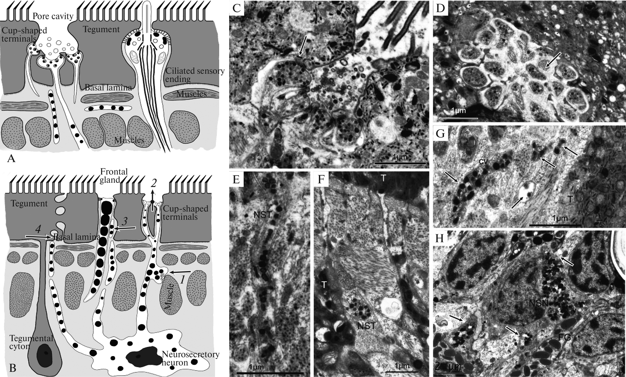 Рис. 1. Свободные терминали в тегументе и нейросекреторные нейроны (НН). а – схема строения ресничных и чашевидных окончаний нейронов в тегументе цестод. б – схема экзо- и эндокринной секреции периферическими НН: 1 – нейромышечный паракриновый контакт; 2 – экзокринная секреция на поверхность тегумента; 3 – контакт с фронтальными железами паракринового типа; 4 – выделение секрета в зоне базальной пластинки тегумента. в, г, д – L. alternans: группа чашевидных окончаний (стрелки) с секреторными везикулами в тегументе (в, г) и продольный срез (д) нейросекреторной терминали (NST), входящей в тегумент. е – P. phocarum: NST в контакте с тегументальным отростком (T). ж – D. dendriticus: паракриновый контакт NST с мышцами под тегументом (стрелки); cv, светлые везикулы. з – P. phocarum: нейросекреторный нейрон (NSN) в контакте с отростками фронтальных желез (FG) и мышцами (стрелки).