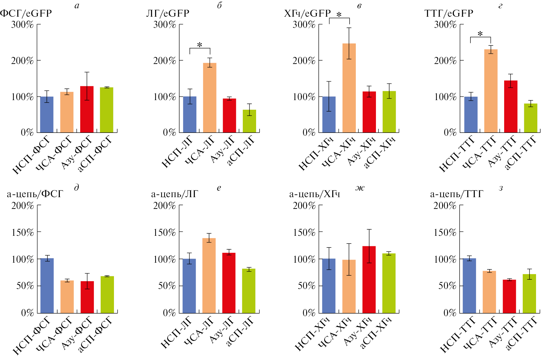 Рис. 2. Титр гликопротеиновых гормонов, секретируемых транзиентно трансфицированной культурой клеток CHO, при варьировании сигнальных пептидов их β-цепей. (а – г) Концентрация гетеродимерной формы гормонов (по данным ИФА), нормализованная на уровень зеленого флуоресцентного белка eGFP в лизате клеток. (д – з) Титр секретируемой α-цепи с нативным сигнальным пептидом (оценка методом ИФА), нормализованный на титр гетеродимерной формы гормона. Представлен средний результат трех независимых биологических повторов, два повтора в ИФА для каждого образца, значения для контрольного пептида НСП приняты за 100%, * – p<0,05, однофакторный дисперсионный анализ, критерий Тьюки. Сокращения: ФСГ – фолликулостимулирующий гор- мон; ЛГ – лютеинизирующий гормон; ХГч – хорионический гонадотропин человека; ТТГ – тиреотропный гормон; НСП – нативный сигнальный пептид β-цепи соответствующего гормона; ЧСА – человеческий сывороточный альбумин; Азу – азуроцидин; аСП — сигнальный пептид α-цепи гликопротеиновых гормонов.