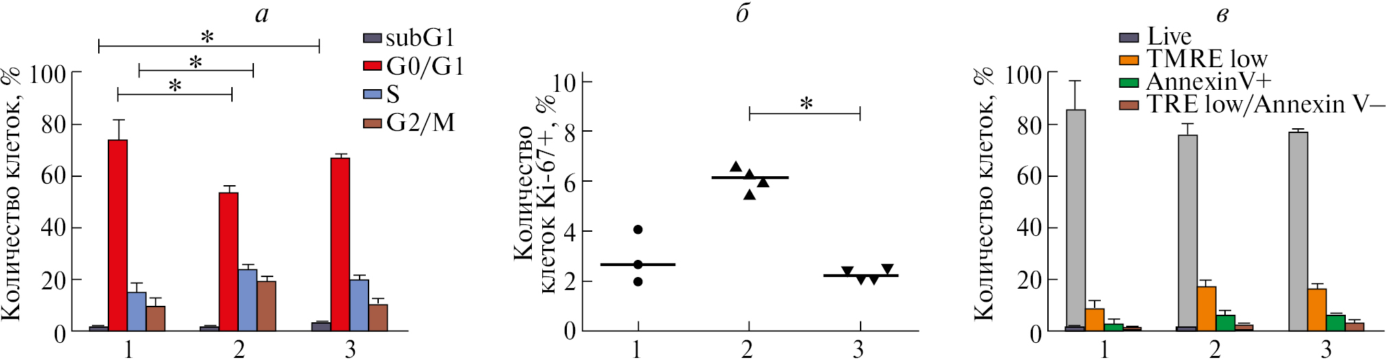 Рис. 2. Основные параметры пролиферации и клеточной гибели в клеточной линии рака простаты РС-3 в контроле (1), при подавлении экспрессии изоформы А миозина 1С (2) и при подавлении экспрессии изоформы С миозина 1С (3). а – гистограммы распределения клеток по клеточному циклу. б – представленность Ki-67+ клеток в образцах. в - гистограммы распределения клеток по стадиям клеточной гибели. Приведено 3 независимых эксперимента, * – достоверные различия между группами, р<0.05, тест Краскелла-Уоллиса, пост-тест Данна.
