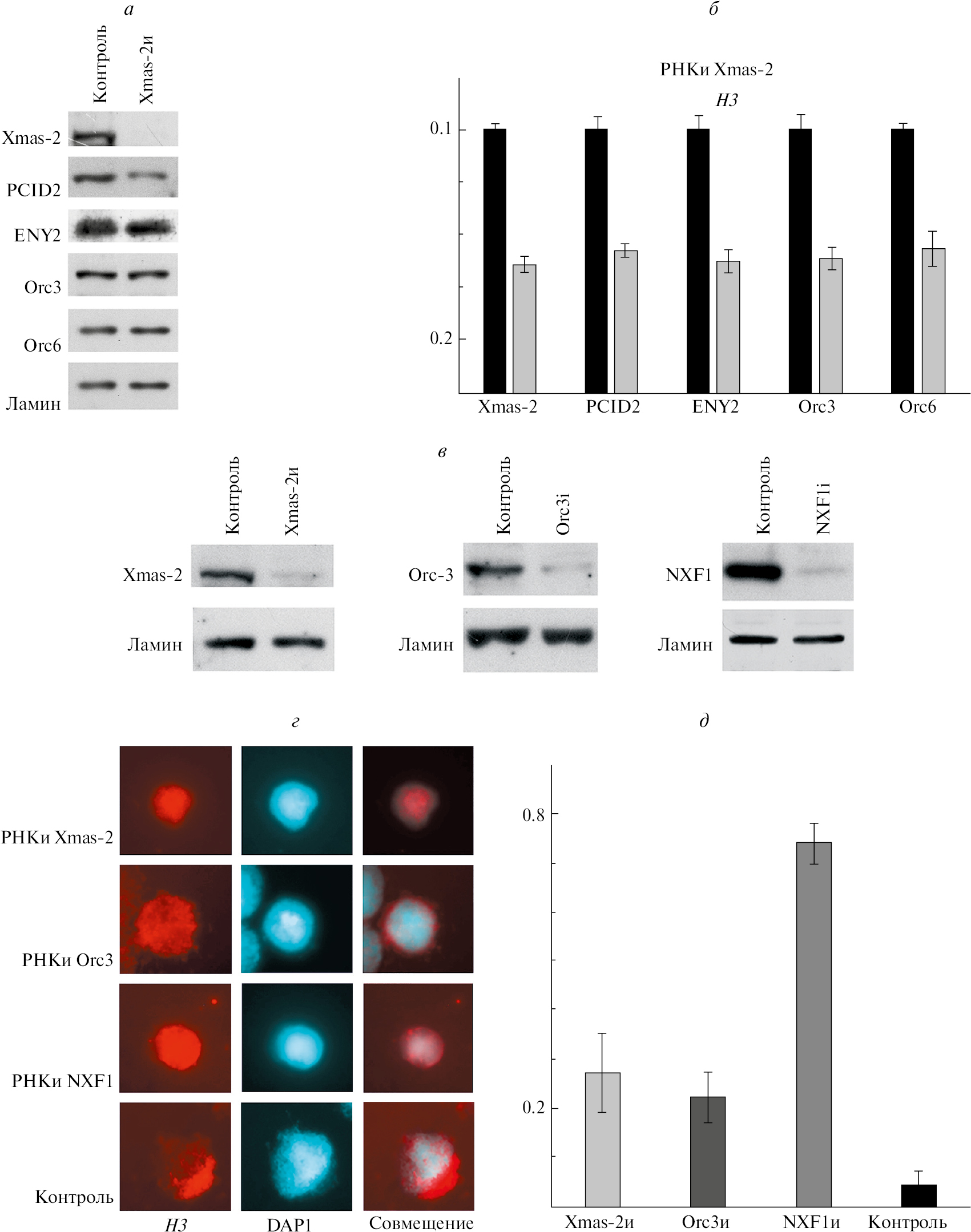 Поэтому с целью снизить уровень TREX-2-ORC комплекса был проведен нокдаун Xmas-2 в S2 клетках методом РНК-интерференции. При нокдауне Xmas-2 уровень экспрессии белка значительно снижался, при этом уровни экспрессии субъединиц PCID2, ENY2, Orc3, Orc6 заметно не изменялись (рис. 2, а). Методом RIP-анализа было исследовано, нарушает ли нокдаун Xmas-2 взаимодействие TREX-2-ORC с мРНП гистонов. Нокдаун Xmas-2 приводил к уменьшению количества ассоциированных с мРНК гистонов как Xmas-2, так и белков PCID2, ENY2, Orc3, Orc6, то есть к уменьшению связывания TREX-2-ORC с мРНП частицами гистонов. Результаты приведены для H3 мРНК (рис. 2, б).