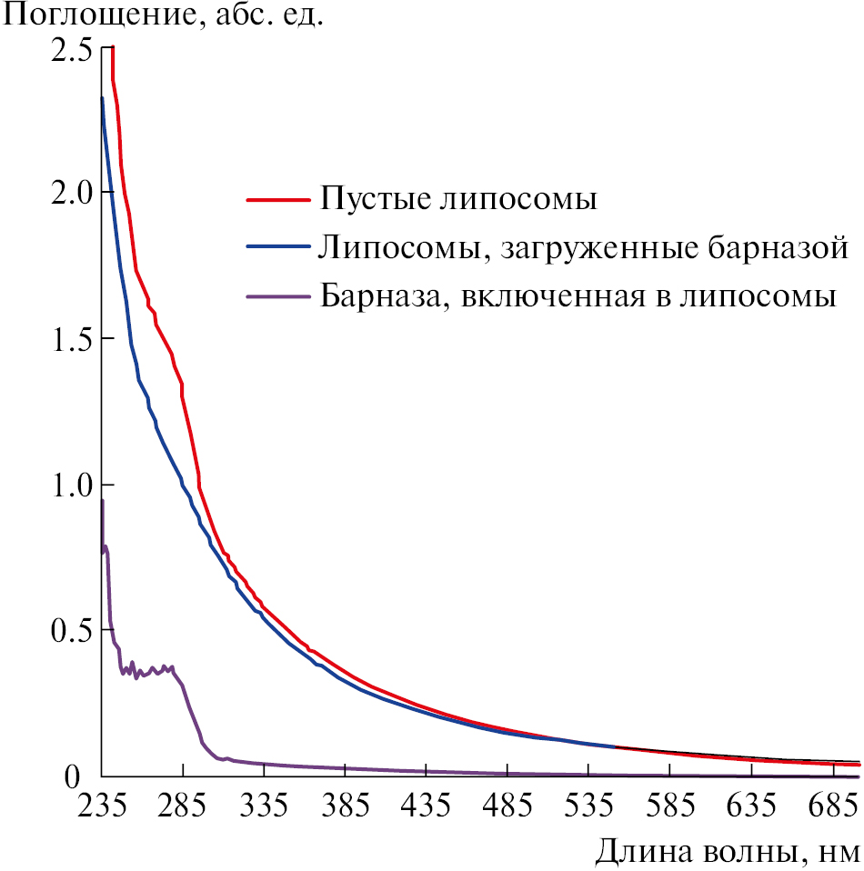 Рис. 1. Спектры поглощения липосом. Красная и синяя кривые – спектры поглощения липосом, загруженных барназой, и пустых липосом, соответственно. Сиреневая кривая – спектр поглощения барназы, загруженной в липосомы, который получен вычитанием спектра поглощения пустых липосом из спектра поглощения протеолипосом.