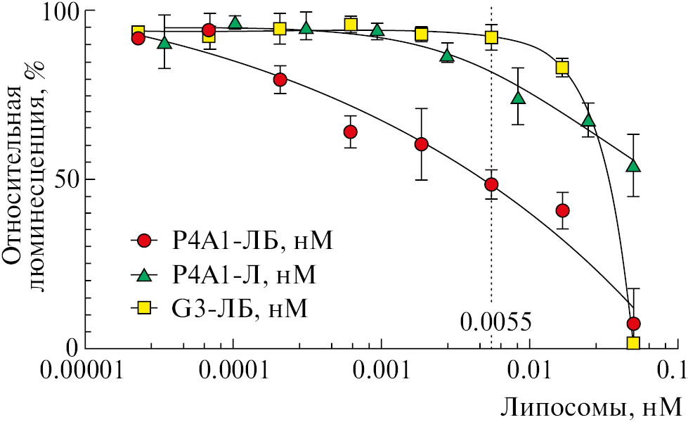 Оценку нейтрализующей активности проводили с использованием псевдотипированных лентивирусов, несущих S-белок SARS-CoV-2 [9] по методике, описанной в работе [10], используя в качестве контроля растворы антитела P4A1 известной концентрации. Серийные образцы анализируемых липосомальных препаратов готовили разведением исследуемых препаратов в среде DMEM с 10 % FBS. Кривые зависимости величин люминесцентных сигналов от разведений препаратов строили с помощью ПО GraphPadPrism 8 и вычисляли концентрацию веществ, обеспечивающие нейтрализацию IC40 псевдовируса.