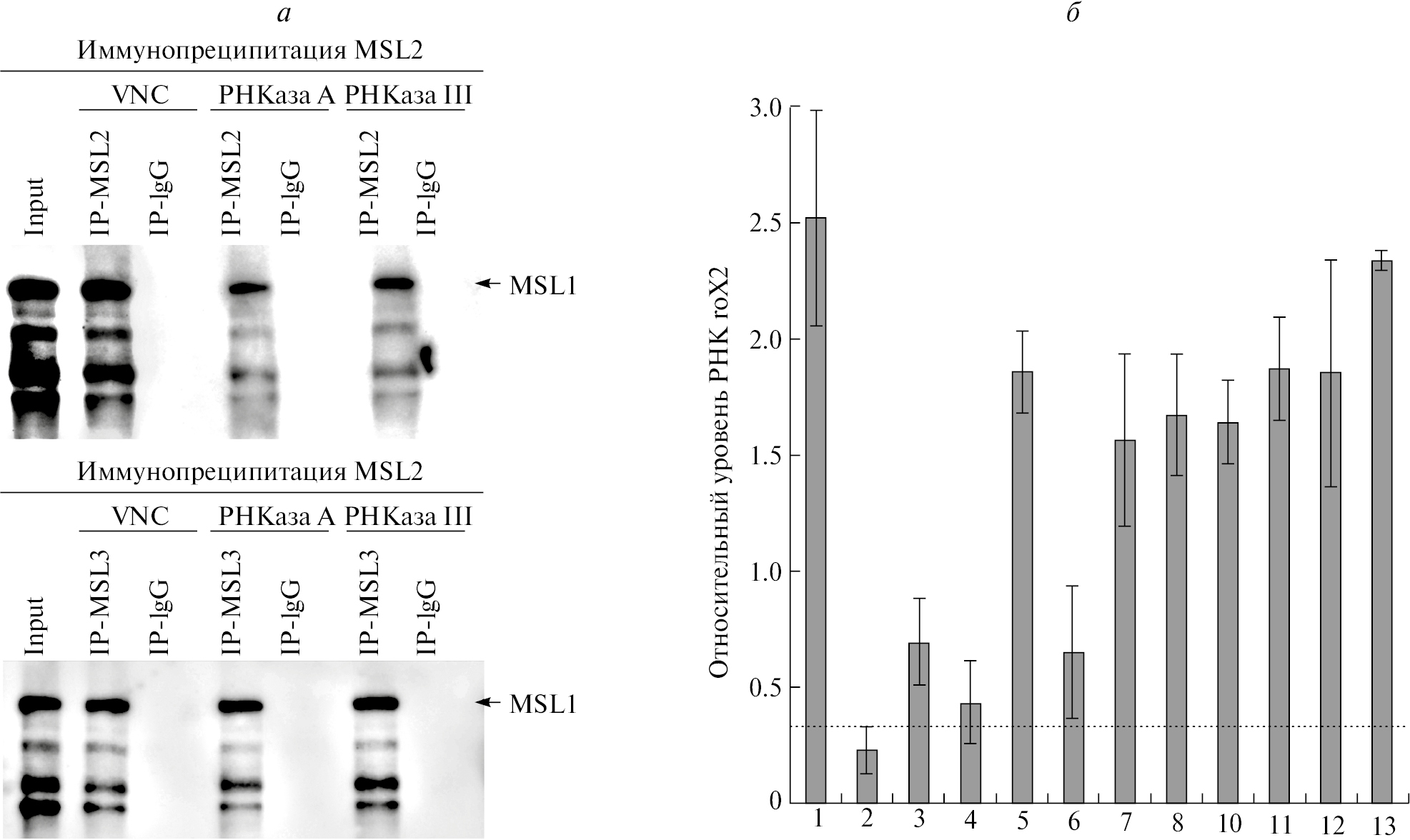 Эксперименты по коиммунопреципитации белков из экстрактов, обработанных РНКазами А и III, показали сходные результаты (рис. 2, а). При иммунопреципитации антителами, специфично узнающими белок MSL3, белок MSL1 продолжает копреципитироваться с эффективностью, сходной с экстрактом, не обработанным нуклеазами. В то же время при иммунопреципитации антителами, специфично узнающими белок MSL2, детектируется примерно двукратное снижение уровня белка MSL1 в образцах иммунопреципитатов по сравнению с преципитатом из экстракта, не обработанного нуклеазами.